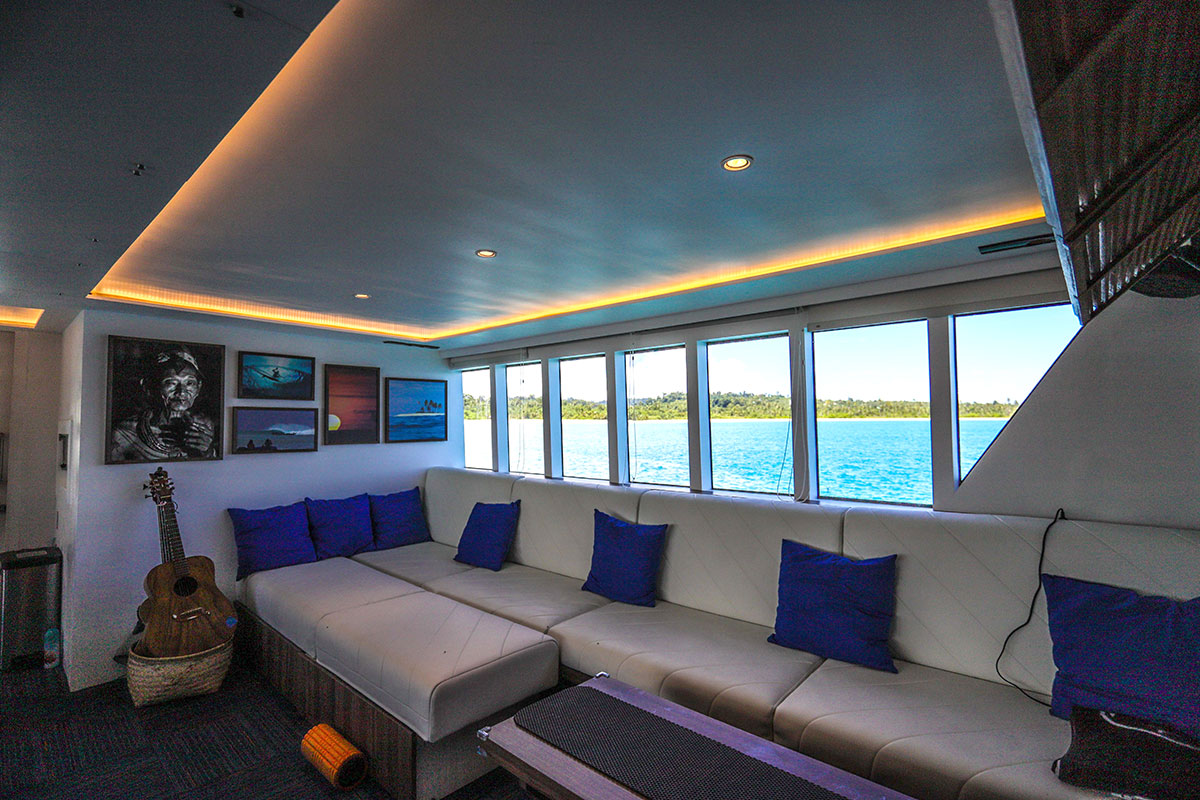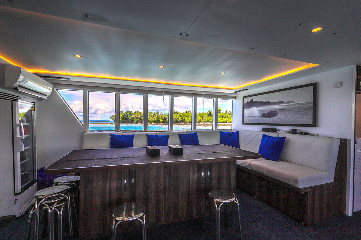 The Star Koat 2 accommodates up to 12 guests across 6 air-conditioned twin-share cabins (each cabin has two single beds). The boat features a large air-conditioned lounge/dining area with home-theatre-style TV setup, shaded top deck for relaxing, board storage, and dedicated surf support vessels (18 ft speedboat + 12 ft tender) for accessing prime reef breaks of the Mentawai/Banyaks region. Built with comfort and performance in mind (twin Nissan RF10 420 HP engines, fiberglass hull, cruise speed ~10-12 knots), the vessel is fully equipped for surf-charter operation with modern navigation and safety systems.